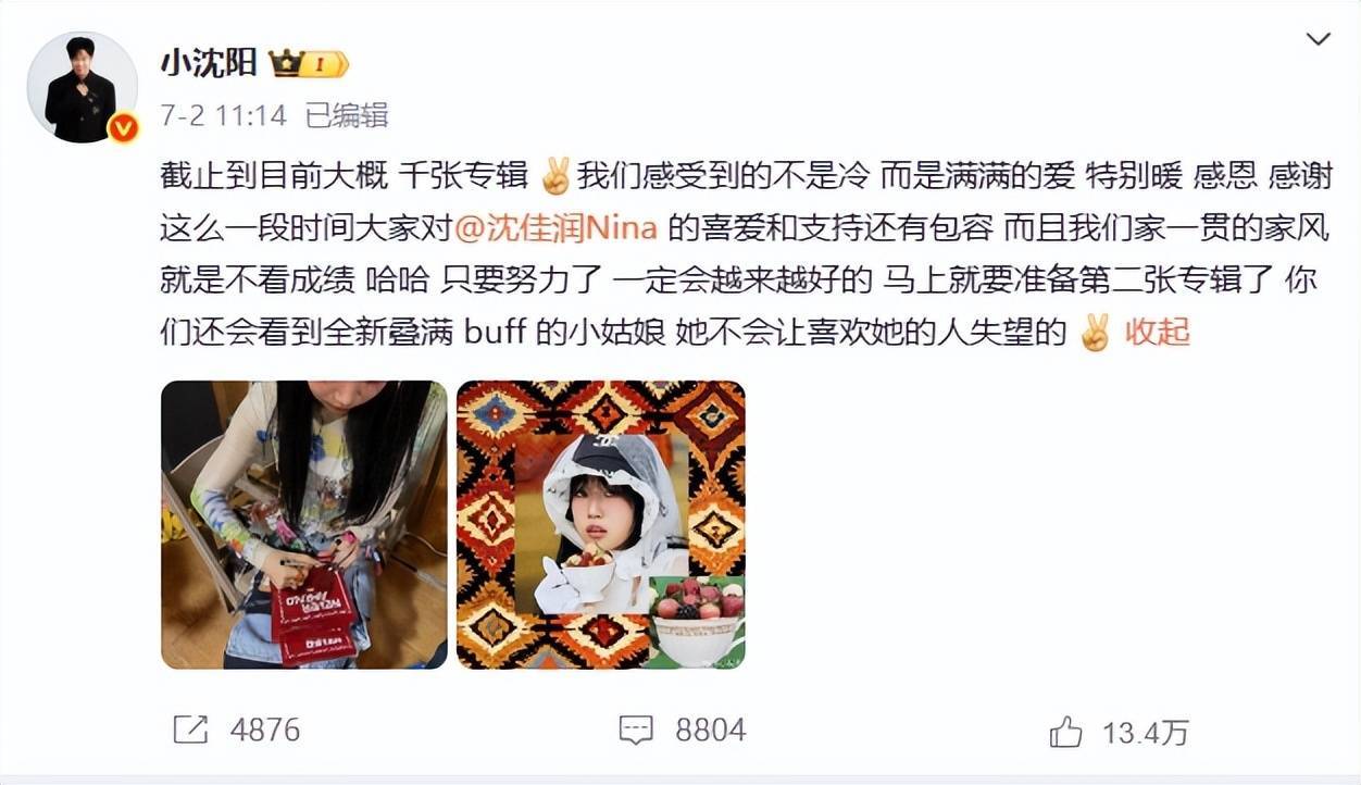 虽然她的实体专辑在网络上的销量并不是很高,但小沈阳也发文力挺自己女儿称自己一贯的家风就是不注重成绩,然后努力就会越来越好。